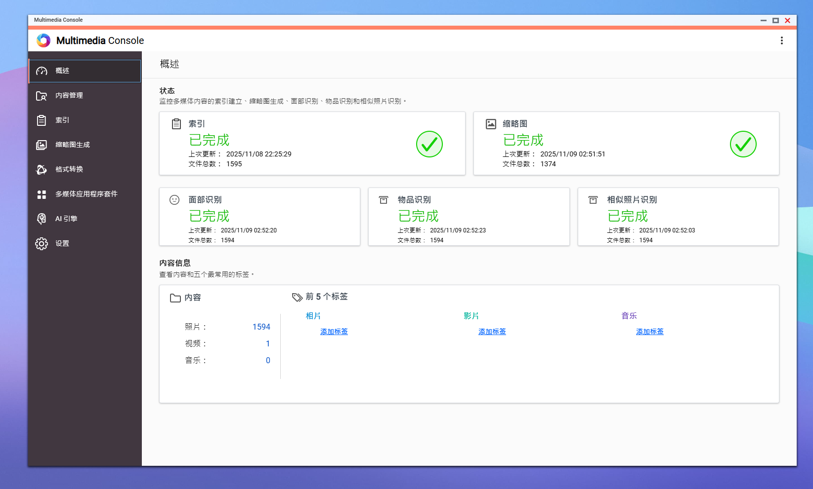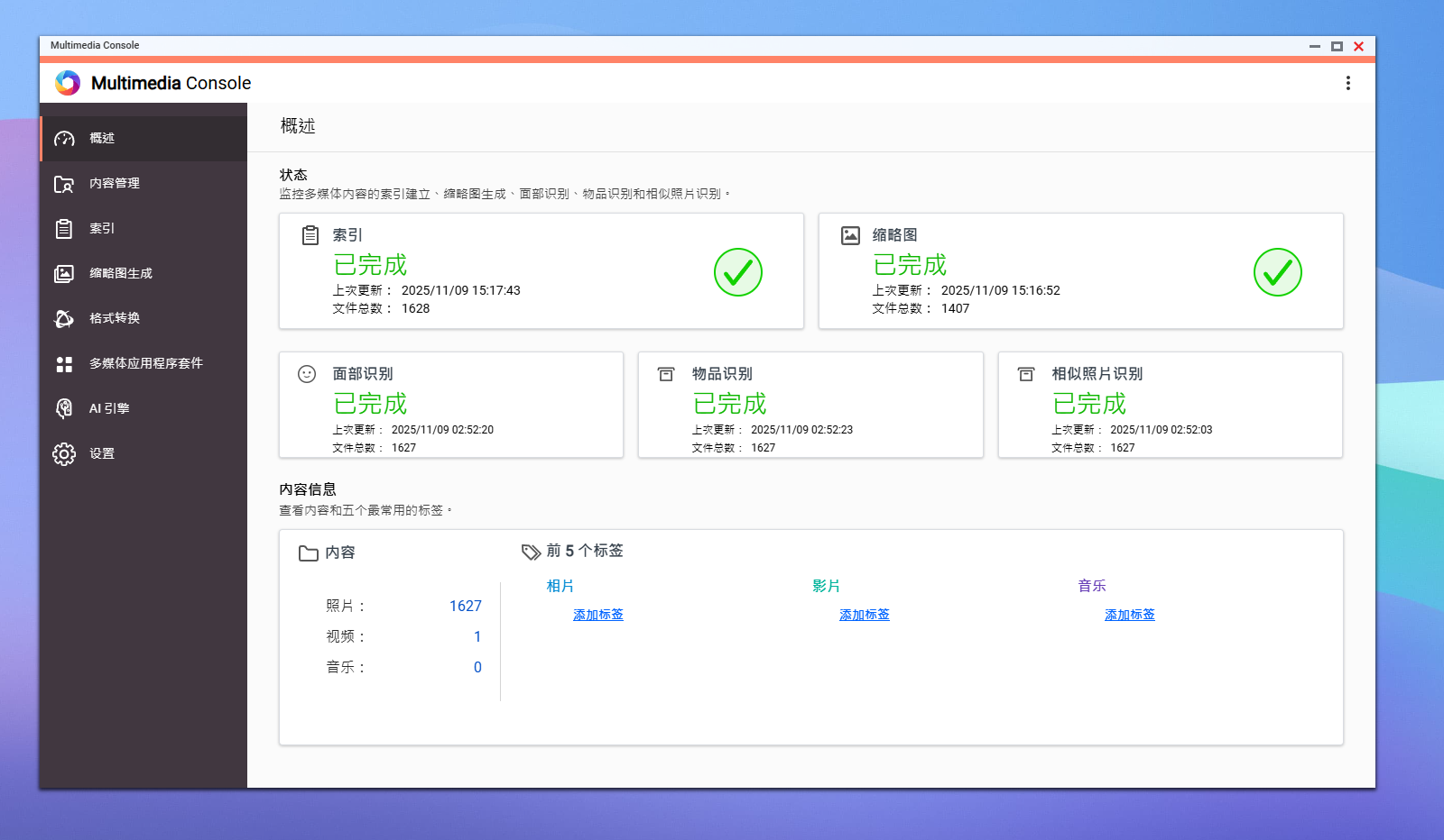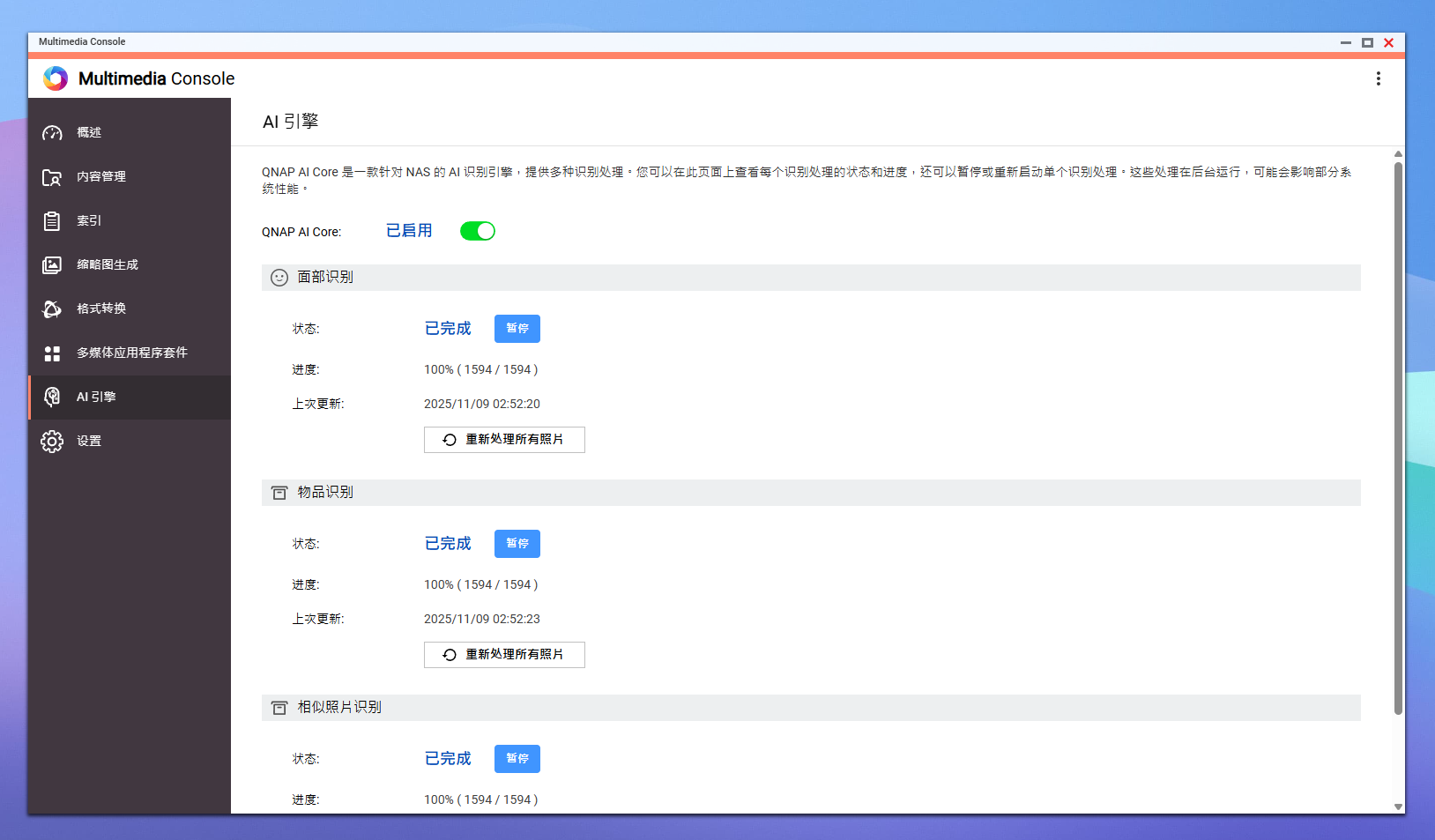 打开 Qu605 的机身,威联通正在内部布局上的工程思一目了然。从板、双 M。2 插槽、SATA 背板取两枚静腔调速电扇形成了焦点区域,结构紧凑却不拥堵。零件采用坚忍的金属框架取典范的防共振布局,让 6 盘位正在高速运转中照旧恬静平稳。如许的设想不只提拔了零件的支持性,也进一步优化了风道效率,正在 NAS 行业内属于上乘水准。左侧区域集成了从板、内存插槽和 CR2032 电池位,布局清晰了然。大面积散热块下方是 Intel N150 处置器,风道设想紧贴首个硬盘仓,无效带走热量,确保零件温控均衡。 Multimedia Console 可谓是多资本办理的焦点中枢。它将索引生成、缩略图建立、面部取物品识别、类似照片比对、格局转换 等功能集中正在统一界面中同一办理,并能间接挪用QNAP AI Core 引擎 进行智能识别取加快处置。用户无需再别离打开多个软件,即可完成所有内容的分类、识别取优化,实现实正的一坐式多智能办理。 值得一提的是,威联通正在平安细节上同样不放松。每个托盘都配备了锁扣设想,能无效防止小伴侣或宠物误触拔盘,特别适合有孩子或养猫的家庭利用。对于多盘位 NAS 来说,这不只是物理防护,更是数据平安的最初一道保障。 跟着智妙手机和相机的机能不竭前进,我们摄影的门槛越来越低,但照片数量却呈指数级增加。从日常随手拍到旅行,再抵家庭取工做素材,动辄上万张图片堆满硬盘。保守的人工分类体例早已难以对付,费时又低效。为了让照片办理实正“从动化”,威联通推出了集 AI 识别、分类取拾掇于一体的智能照片办理系统——。