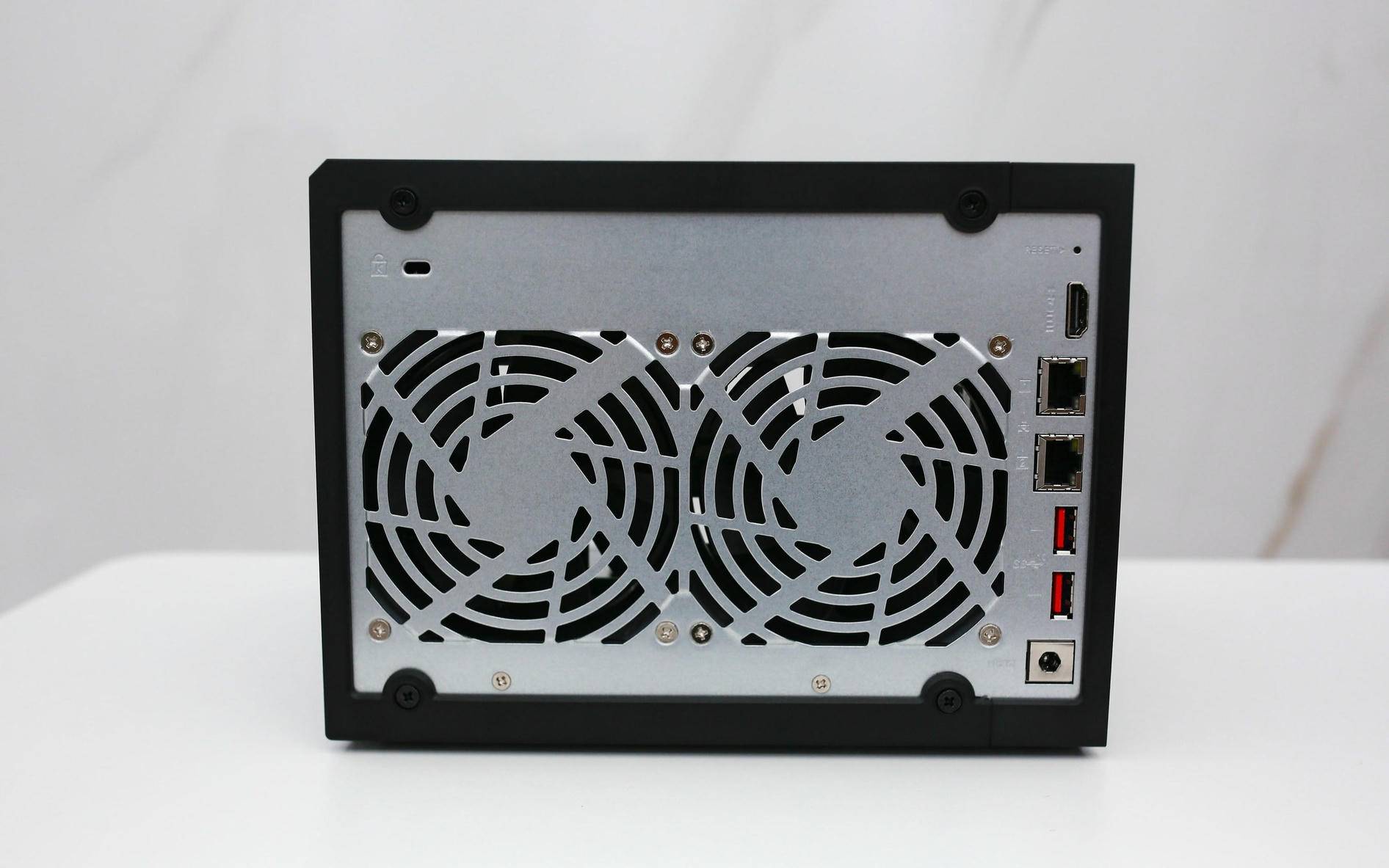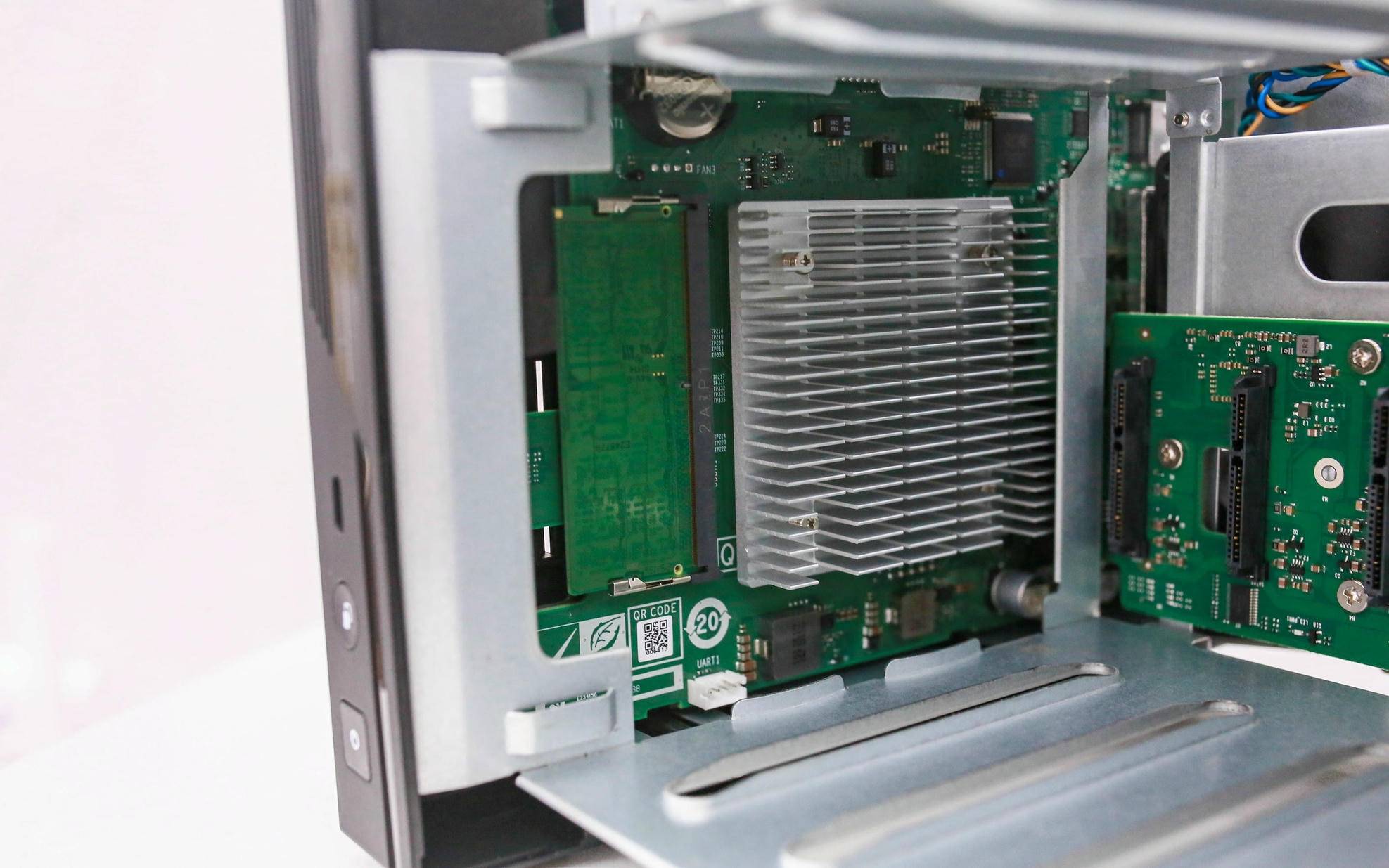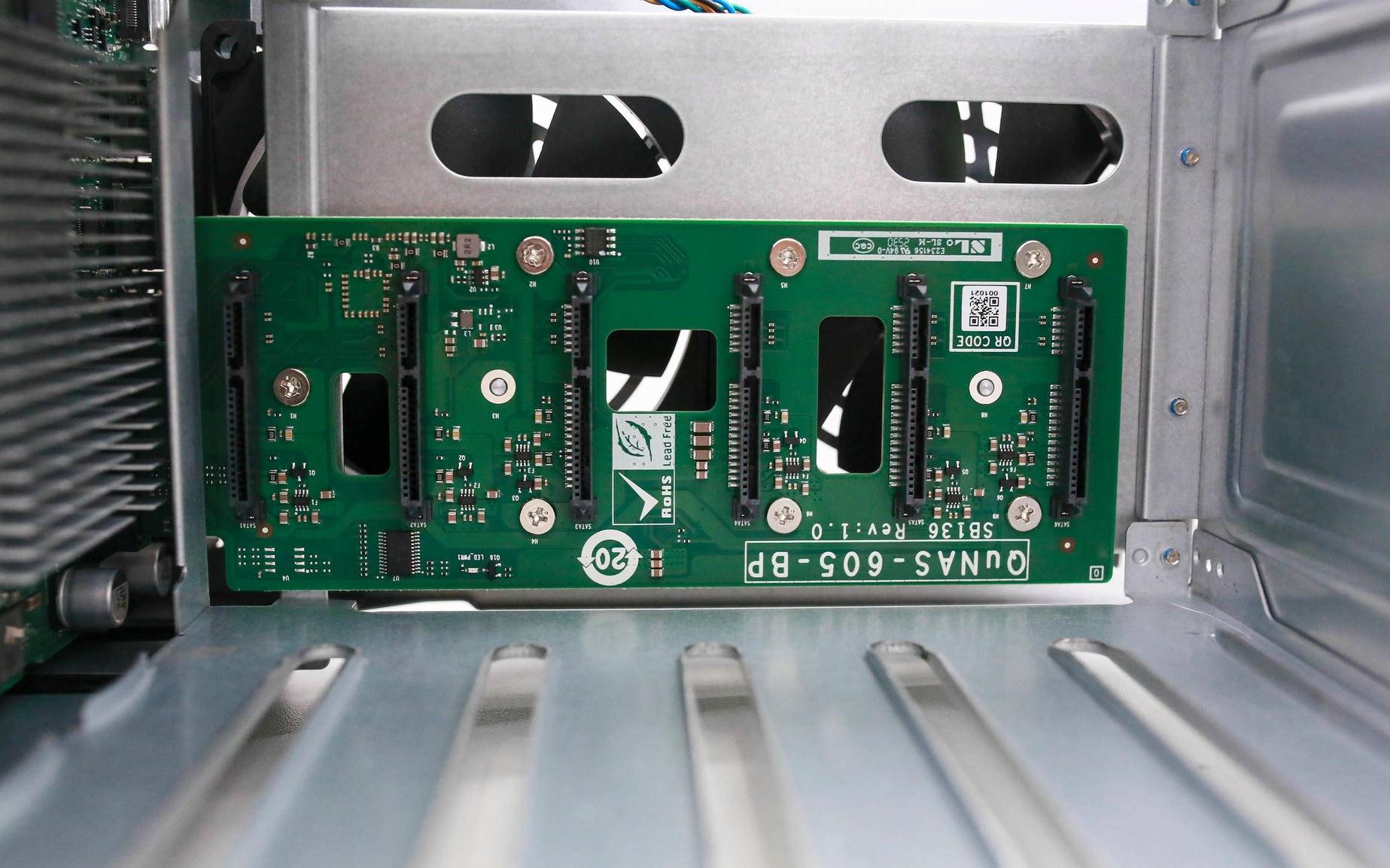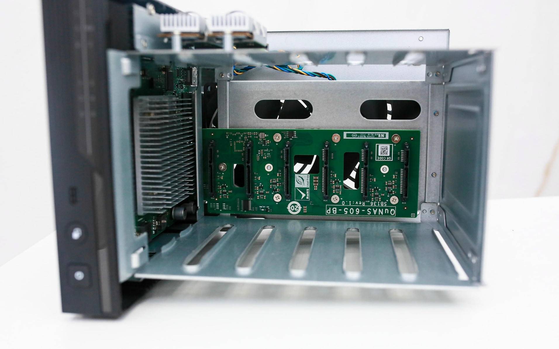 Qu605 的机身左侧布满竖条状散热开孔,正好对应从板焦点区域,构成天然的进风通道。如许的结构正在连结静音的同时,能高效导入冷空气,让从板及电源模块长时间高负载运转照旧不变靠得住。比拟保守的单侧出风设想,这种“面向气流”的布局明显更具工程思维,也表现出威联通正在散热优化上的深挚功底。