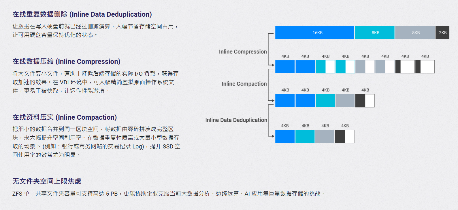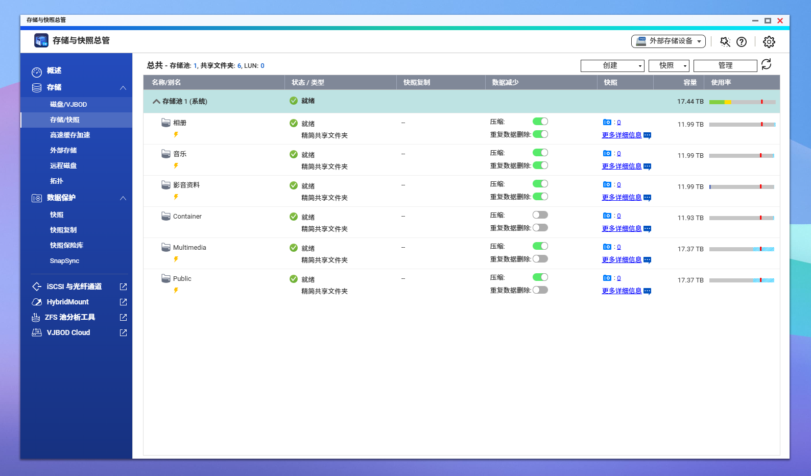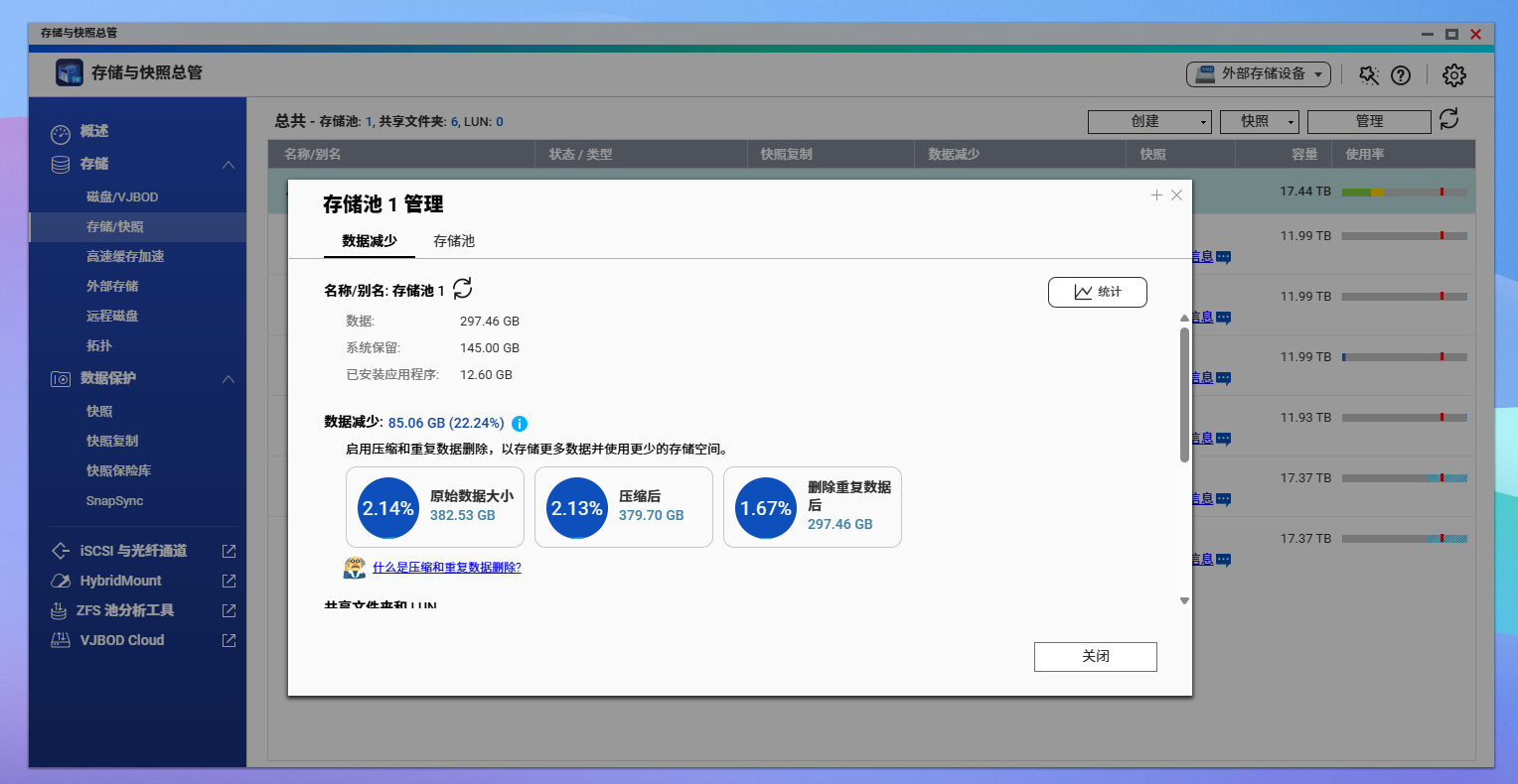 「存储取快照总览 办理 数据削减」界面曲不雅查看压缩取去沉后的空间节流环境。虽然对于视频类高压缩素材,缩减结果无限,但对于文档、表格、项目文件等类型的数据而言,ZFS 带来的节流比例十分可不雅。它不只让 NAS 更“伶俐”,也让数据存储从被动节流改变为自动优化。
