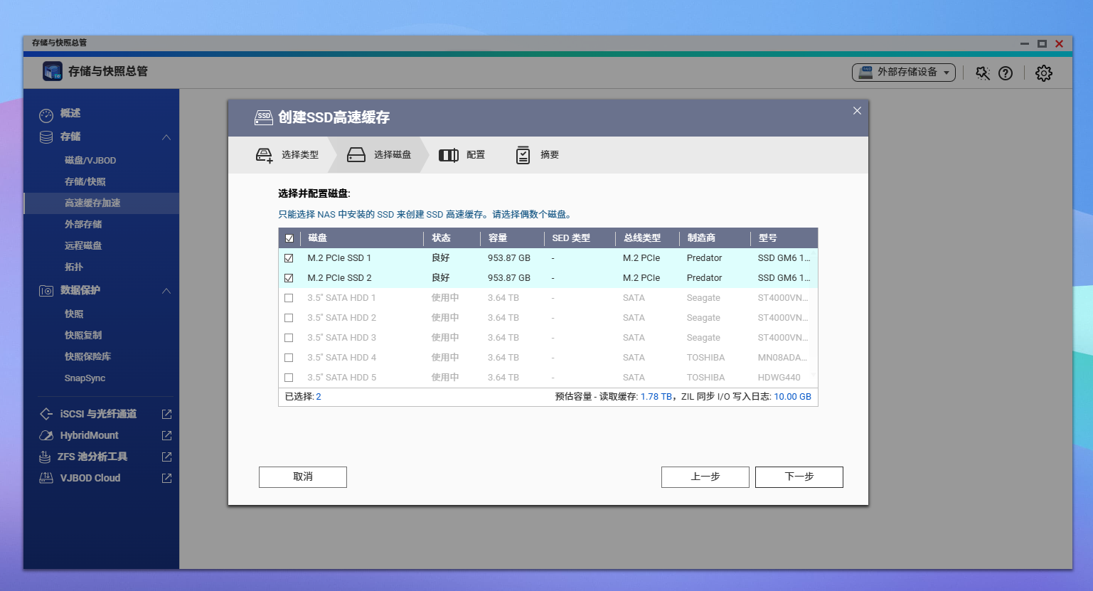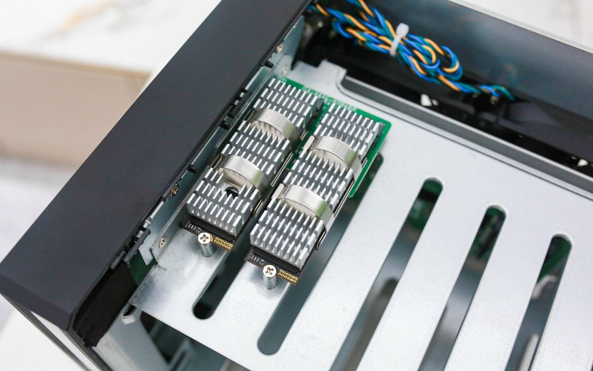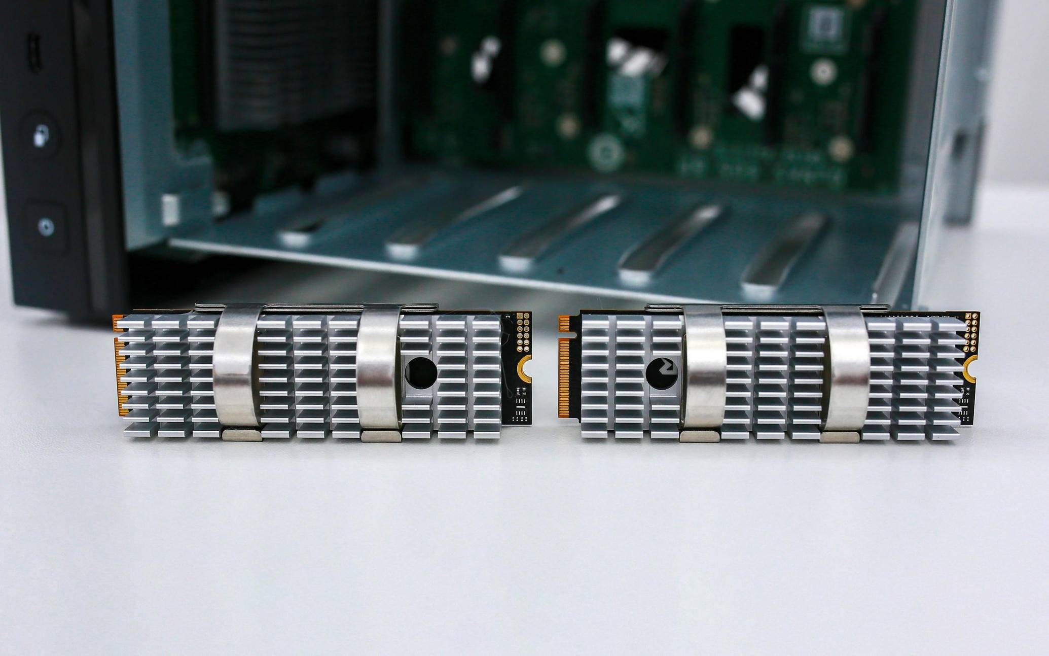 正在硬盘笼的上方,威联通为 Qu605 预留了两个 M。2 NVMe 2280 插槽,可矫捷设置装备摆设为 SSD 缓存或高速存储区。如许的设想让用户正在大容量机械硬盘阵列之外,仍然能享遭到 SSD 带来的高 IOPS 取低延迟体验,特别正在数据库、虚拟机、AI 推理等高并发场景下劣势较着。
